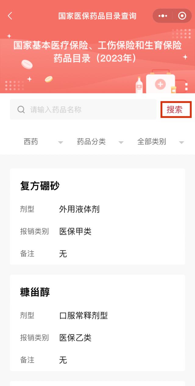 第二步:进入服务页面,根据查询的药品类别调整“药品目录”选项(默认情况下不调整为“西药”),在上面的搜索框中输入关键词,点击“搜索”查询;如果你没有得到它,这意味着药物不在目录范围内。