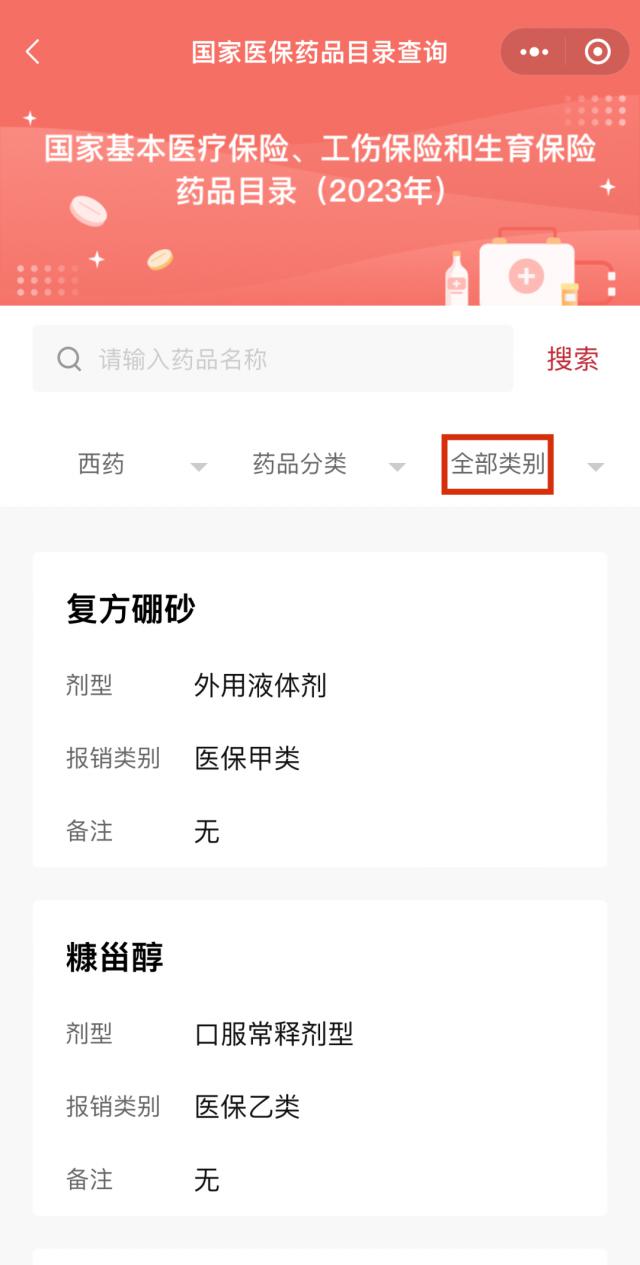 与此同时,还可根据需要,对“药品分类”、“药品类别”进行选择,医疗保险药品信息一目了然。