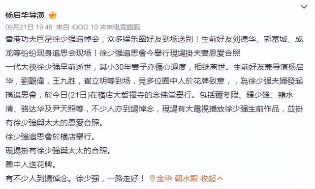 原来,导演杨启华在发文中提到,演员徐少强的追悼会是在横店举行的。