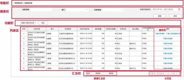 一种标准的后台页面框架应主要分为:搜索框、功能栏、目录区(包括操作列)、总结栏(分为数据统计区和分页区)。
