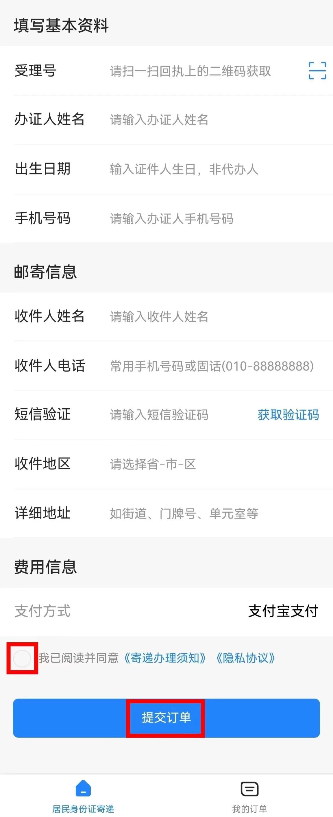 填好资料后,查看下面的“阅读并同意”按钮,点击“提交订单”并支付邮费即可完成操作。