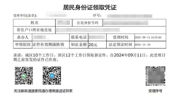 领取居民身份证并发送至个人业务的,必须在办证当天22:00前申请,业务范围在北京市行政管辖范围内,请保持揽收手机畅通。