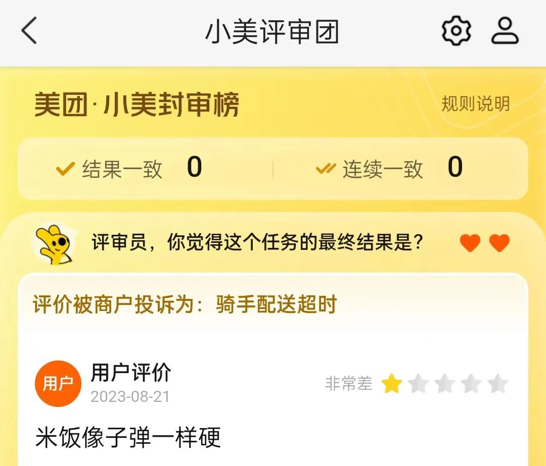 好了,四份材料都交给你了,你会做出怎样的判断?当您点击支持用户的“适合展示”或支持商家的“不适合展示”时,您的任务将结束。投诉的审查时间为24小时。24小时后,少数人服从大多数。根据最终投票结果,判断该评估是否会出现在商家的评估页面上。其实这个结果不会通知你。如果你的判断少数没有被采纳,只会显示在你的评审记录中,不会对你产生任何其他影响。只有你能看到你的“采纳率”,你也可以在评论区表达你对不服气的投票结果的支持或不满。每天“法官”的任务是五个问题,一切对你来说都是免费的。事实上,如果你来到这里,“小美评审团”无非是一个绣花枕头,只是一个装裱门面“突出公平”的机制。用户在享受了“清汤大师”在短时间内做出“裁决”的快感后,会失去兴趣和热情。毕竟“免责”一方面是用户的需求,但也剥离了用户对裁决本身的参与和投入感。