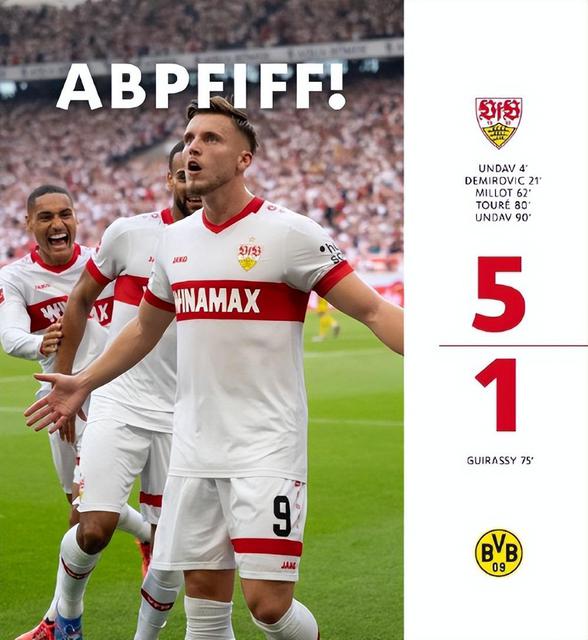 只是这并没有挽救多特的失败, 80 分钟,米约右路下底连接 2 人们横敲,比拉勒 - 图雷很容易推入网络,1:4!第 91 分钟,埃姆雷 - 詹中圈断球,斯图加特当场反击,昂达夫单刀破门完成梅开二度,1。:5!最后多特 1:5 惨败,遭受本赛季最大的失败;排名也直接排在联赛第一 2 跌到了第 8。
