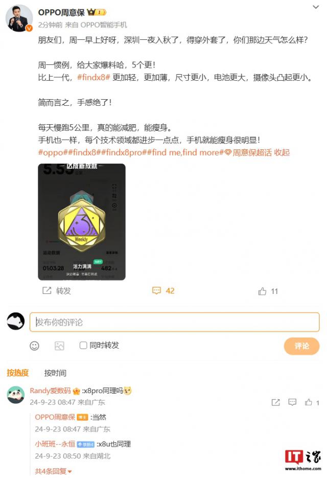 IT 世家 9 月 23 日消息,OPPO Find 产品负责人周意保今天发了一条“爆料”,OPPO Find X8 手机比上一代(这里预计是 OPPO Find “更轻,更薄,更薄,X7)尺寸更小,电池更大,摄像头凸起更小"。