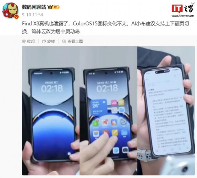 另外,周意保曾在 9 月 9 在日常直播中,展示了一款带有黑色保护套的新机器。博主 @数码闲聊站 称之为 OPPO Find X8。该手机 UI 风格和新版本 ColorOS 14 类似地,桌面小布建议支持滚动页面转换。此外,手机前摄区显示应用即时活动,博主称“液体云改为中心灵动岛”。