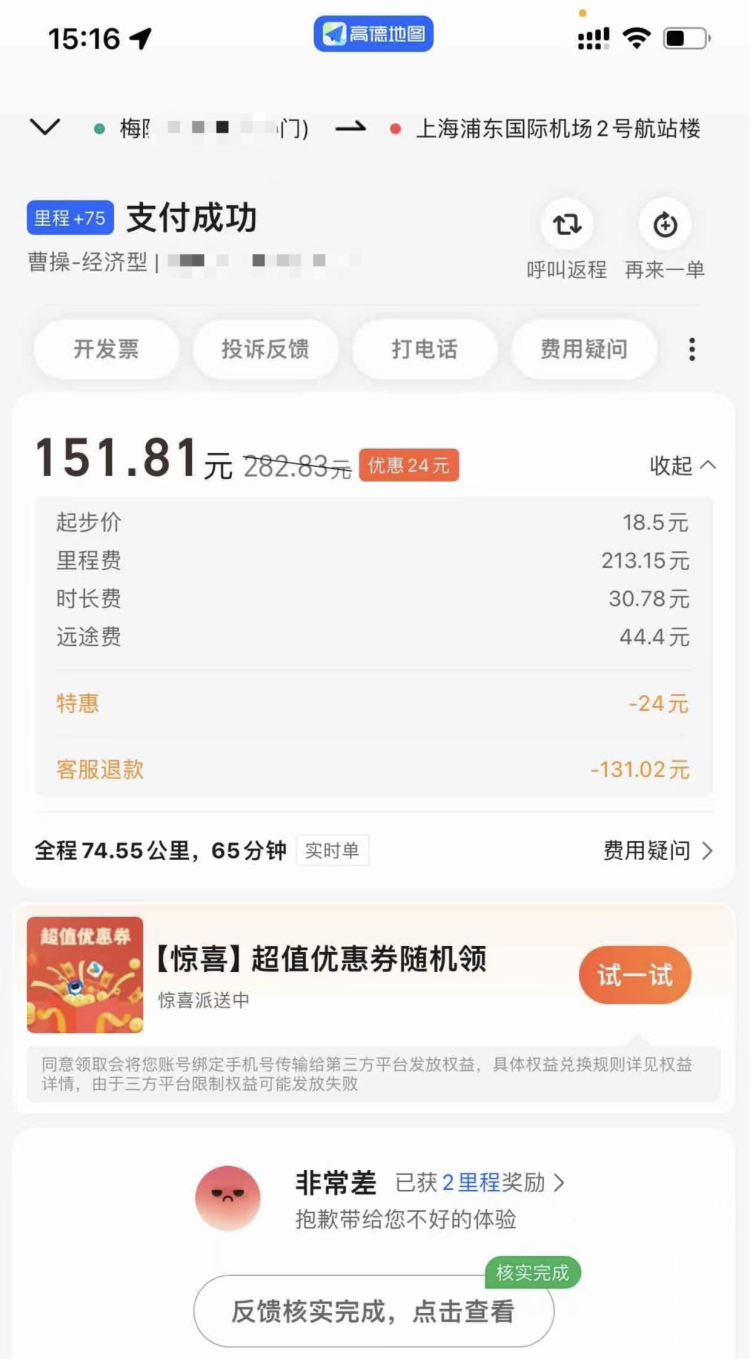 办完所有手续后,于先生开始在高德出租车平台上投诉,离航班起飞还有一段时间。“我根据平台的要求提供了所有的证据。下午到达目的地后,看到平台已经认可了我的投诉,给了我一些退款。”