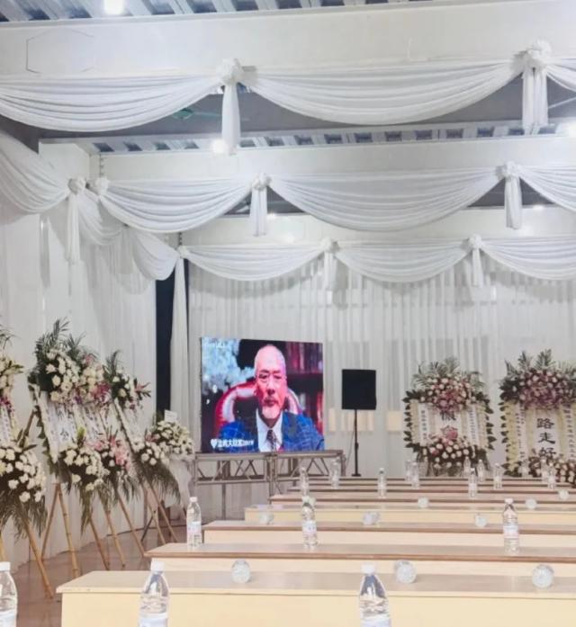 思考会的场地比较小,场地布局也很简单。周围都是白色的序幕,徐少强生前的影视剧在侧面的大电视上滚动。