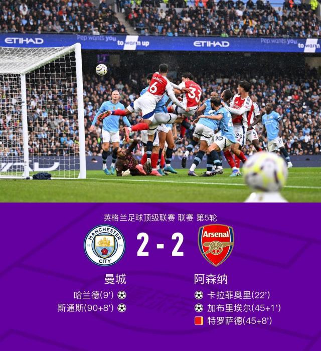 在英格兰足球顶级联赛中排名第一 5 在这轮比赛中,曼城主场迎战阿森纳。上半场,萨维尼奥助攻哈兰德单枪匹马破门,京多安任意球中柱,罗德里膝盖受伤退场,卡拉菲奥里远射破门扳平,萨卡角球助攻加布里埃尔门口头球破门,特罗萨德两个黄变一个红被罚下;下半场,沃克远射被拉亚扑灭,哈兰德泰山压顶头球被拉亚神扑灭,格瓦迪奥尔两次凌空射门被拉亚堵住,斯通斯读秒在伤停补时阶段绝平。在这场激烈的对决中,曼城和阿森纳握手言和。