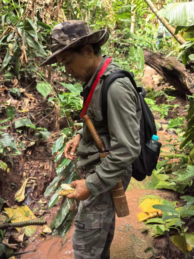 我被分在 B 团体,带领团队的是一个当地的基诺人,也是过去的猎人。他的腰上有一把40厘米左右的砍刀,主要用于雨林开路。基诺人的名字是直译的。我们称他为包大人。