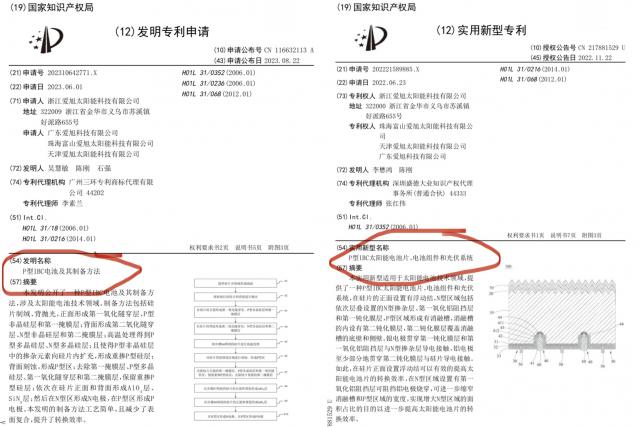 在爱旭股权 2022 在每年申请的专利中,还可以清楚地看到名字包含“ P 型 IBC 太阳能电池片"。