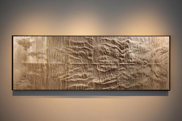 张晓栋受中国古籍龙鳞制作和阅读时的褶皱启发,让久违的书香以个人发明的“千页”语言获得简单的形式。展览中的“千页”系列作品(包括“无尘”系列、“觉者”系列、“亚马逊的呼唤”等。)充分利用了呼吸节奏中中国艺术万物的生命原理,重新打开了绘画平面,创造了独特的“2.5维空间艺术表达”。使艺术在千页褶皱之间荡漾起来。