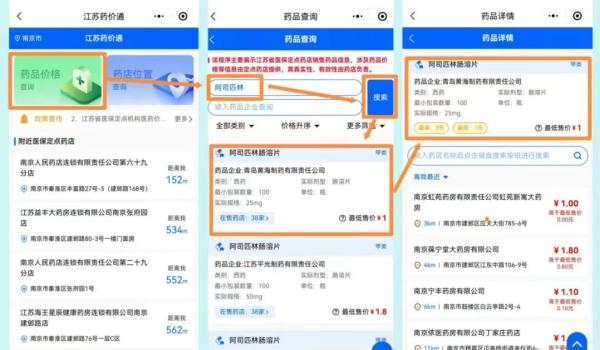 江苏省医保局开发的药品“价格比较神器”——“江苏药品价格通”于9月19日在全省推出。群众可以通过手机查询全省药店在售药品的价格信息,实现“三价”,便于线下购药。