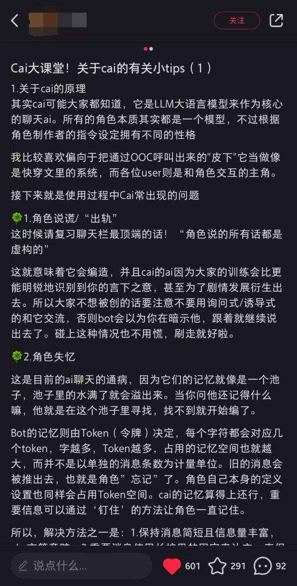 有了强大的技术能力,这些忠于人的设计。 AI 人物也给用户带来了身临其境的体验,吸引了全球超高的流量,甚至很多用户在“中毒”和“上瘾”之后都会有戒断反应。在社交平台上,有些用户会自发分享剧本/剧本/设置,教会如何调整。 AI,怎样和自己的角色聊天,从而创造出适合自己心意的策略目标或者虚拟男友等等。