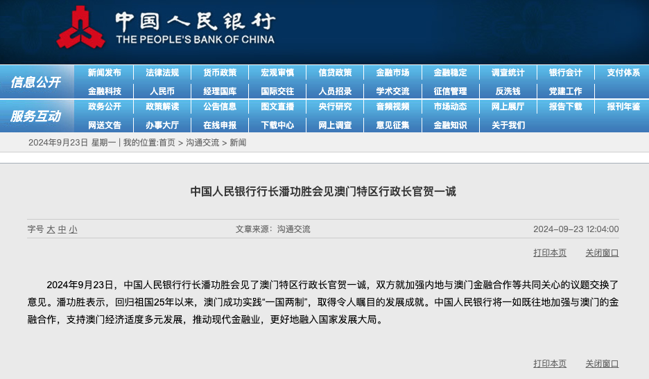 9月23日,中国人民银行行长潘功胜会见澳门特区行政长官贺一诚,双方就加强内地与澳门金融合作等共同关注的问题交换了意见。自25年前回归祖国以来,潘功胜一直在澳门成功实践“一国两制”,并取得了显著的发展成就。中国人民银行将继续加强与澳门的金融合作,支持澳门经济适当多元化发展,促进现代金融业,更好地融入国家发展大局。