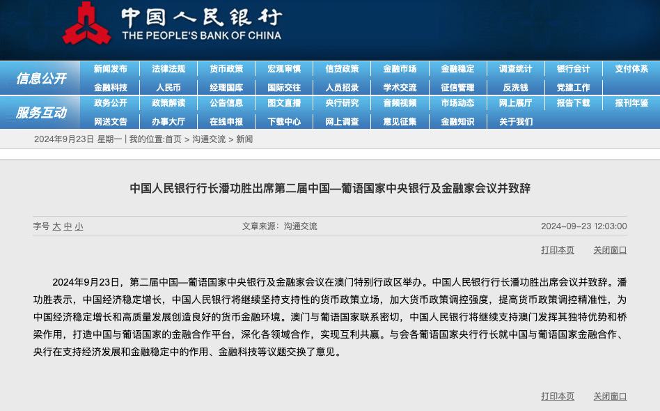 第二届中国-葡语国家央行和金融家会议于9月23日在澳门特别行政区举行。潘功胜,中国人民银行行长,出席会议并致辞。潘功胜表示,随着中国经济的稳步增长,中国人民银行将继续坚持货币政策整合的立场,增加货币政策调控的强度,提高货币政策调控的准确性,为中国经济的稳定增长和优质发展创造良好的货币金融环境。澳门与葡萄牙语国家有着密切的联系,中国人民银行将继续支持中国与葡萄牙语国家建立金融合作机构,深化各领域合作,实现互利共赢,发挥独特的优势和桥梁作用。与会的葡萄牙语国家央行行长就中国与葡萄牙语国家的金融合作、央行在支持经济发展和金融稳定方面的作用、金融技术等问题交换了意见。