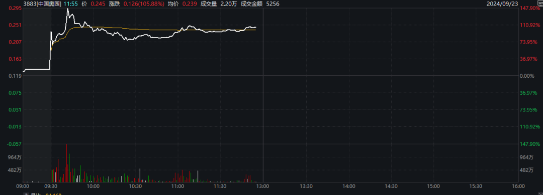 今天港股市场上有多只股票大幅上涨,中国奥园涨幅较大,盘中一度暴涨近150%。
