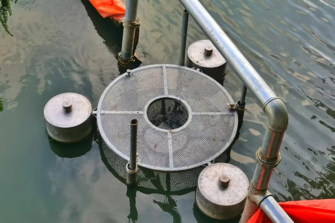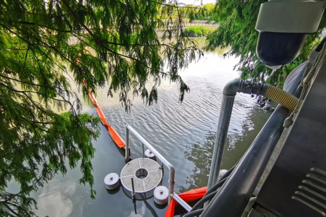 在设备运行过程中,可以发现漂浮在周围的树叶、树枝等垃圾,沿着阻挡带不断接近吸附设备,然后全部吸入进行处理,河流明显干净了很多。