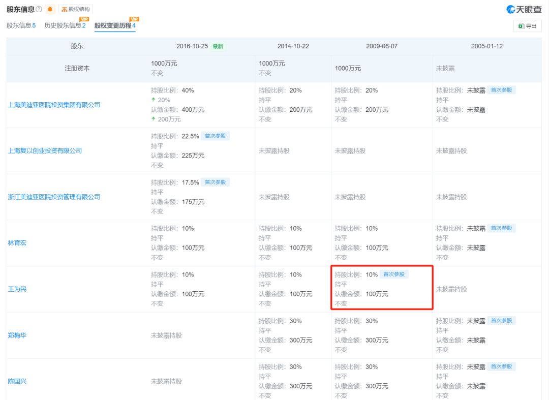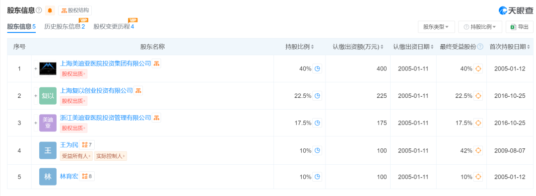 天空调查显示,该院大股东为上海美迪亚医院投资集团有限公司(以下简称“美迪亚集团”),持股比例为40%,法定代表人和实际控制人为王为民。