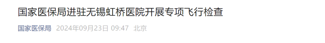 9月23日上午,国家医保局官方微信微信官方账号发文称,国家医保局今天上午派出飞行检查组进行专项飞行检查,针对近期网上举报的无锡虹桥医院涉嫌诈骗保险。