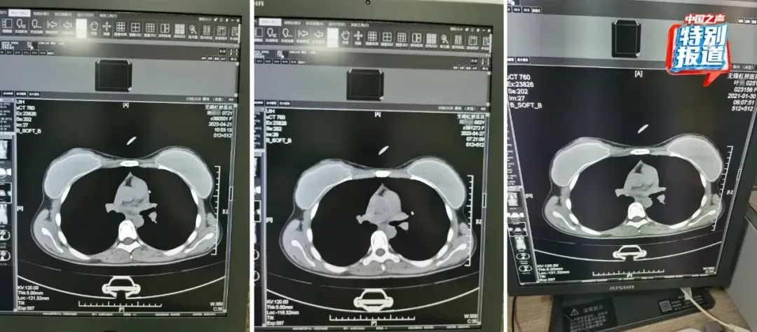 在被举报的病历中,杨某某(72岁)和邱某某(62岁)的病历根据他们拍摄的电影进行了诊断,但他们找不到相应的图像。6月份,他们发现了自己的CT图像。根据系统记录,这两个人都是2023年4月做的胸部CT。从影片中可以清楚地看到,两个患者的挂件形状、大小和位置基本相同。不仅这两位老年患者的CT形象相似,朱博士也发现,2021年在他们科做过CT的25岁女性叶某的电影中,也有看起来非常相似的吊坠。人们看到,三个人的电影几乎一模一样。