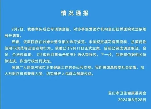 8月28日,昆山市卫生健康委发布情况报告。通知称,8月8日,昆山市卫生健康委牵头成立专项调查组,依法对涉案民营医疗机构昆山虹桥医院进行调查。经调查,该医院涉嫌未遵守相关诊疗规范、未按规定填写病历、抗菌药物使用不合规等违法行为。昆山市卫生健康委于8月12日正式立案。