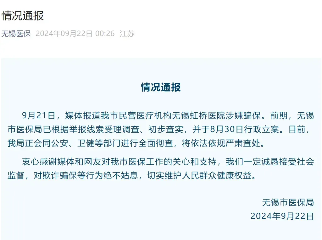 9月22日凌晨,无锡市医保局报告了当地民营医疗机构无锡虹桥医院近期媒体报道的涉嫌保险欺诈情况,称前期根据报道线索受理调查,初步核实,8月30日行政立案。当前,无锡市医保局正会同公安、卫生等部门进行全面彻底调查,将依法严厉查处。与此同时,无锡市医保局也强调,诚恳接受社会监督,绝不原谅欺诈保险等情形。