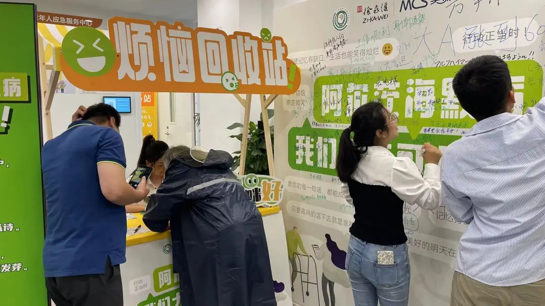 在万体汇党群服务中心邻里汇,围绕“预防、关怀、健康”三个关键词展开了一系列活动,帮助老年居民增强对大脑健康的认识,提高大脑健康的概念。“总是半夜醒来尖叫,在床上排泄,脾气暴躁……”在治愈区,患者及其家属写下心中的苦恼,投入到“情绪粉碎机”中。;在健脑游戏区,通过一系列游戏互动,帮助老年人多维识别和预防老年人认知障碍;以及记忆、专注、反应和执行的各种训练。居民们热情参与,并写下了对大脑健康的美好祝愿。