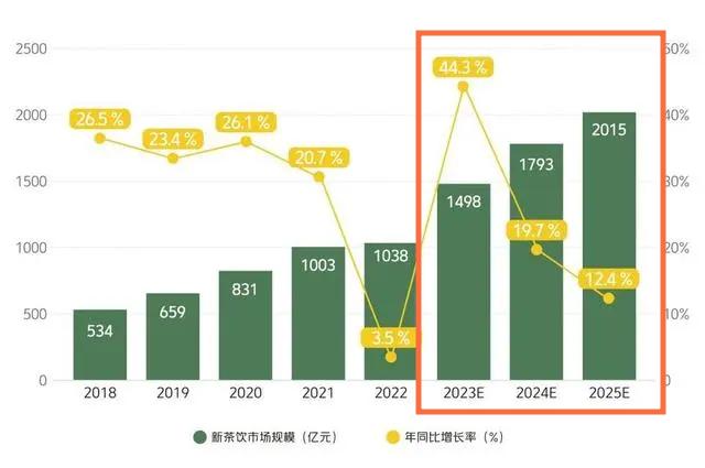 据《2023新茶研究报告》显示,2023年,当各品牌纷纷加入时,整个行业的市场增长率一度达到44.3%,但在2024年,、2025年,行业增长率迅速下降到19.7%和12.4%。