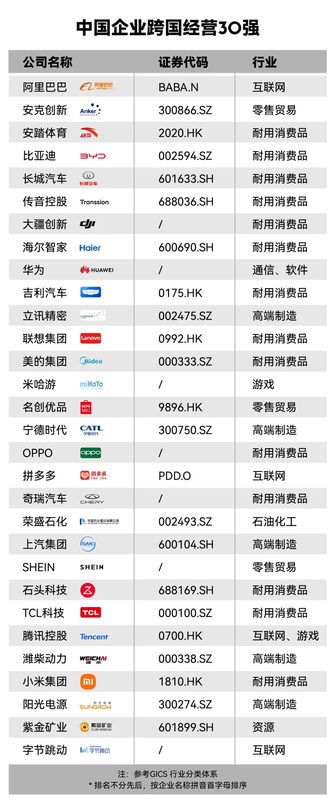 本研究样本覆盖国内上市公司,市值超过100亿元,包括a股和h股、在全球竞争中,海外上市的中概股和一些大型非上市公司位居行业前列。企业经营业绩(包括企业收入、净利润、海外收益及其增长率等基本财务指标)、综合分析了商品海外市场份额、竞争力水平、海外办公室和R&D基地的实体规模、海外员工数量、国际投资者比例、2022年以来的股价表现等数据,选择了30家实现全球稳步扩张的中国企业。公司总市值为 收盘价以2024年8月1日为准。非人民币货币,按年底汇率转换。股价表现以 2022年8月1日至 对2024年8月1日复权收盘价涨跌进行统计。注意:按公司名称首字母排序,排名不分先后;行业分类参照Wind行业。