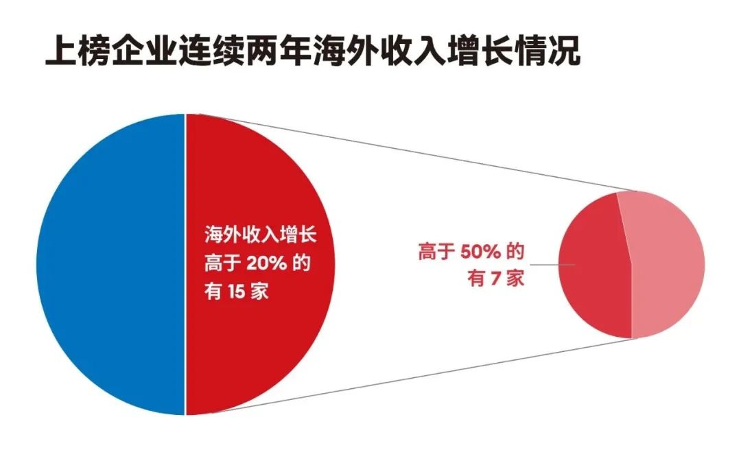 在今年的榜单中,过去几年有一半的公司海外收入增长了40%,其中5家以上的公司海外收入翻了一番。除了显著增长,中国企业也正式进入全球化运营的重要时间窗口。