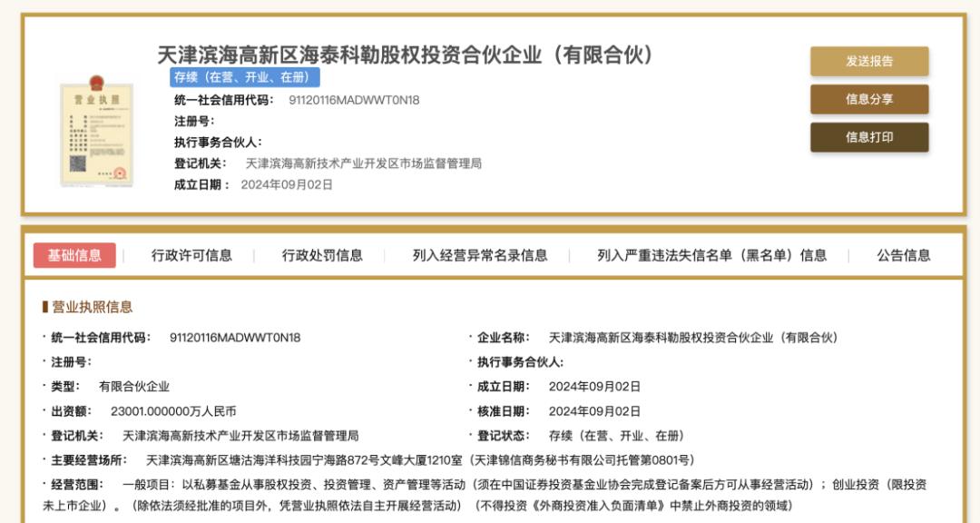 投资界-解码LP了解到,天津市首只国有资产参与的私募S基金——海泰科勒基金成立,注册资本23亿元。