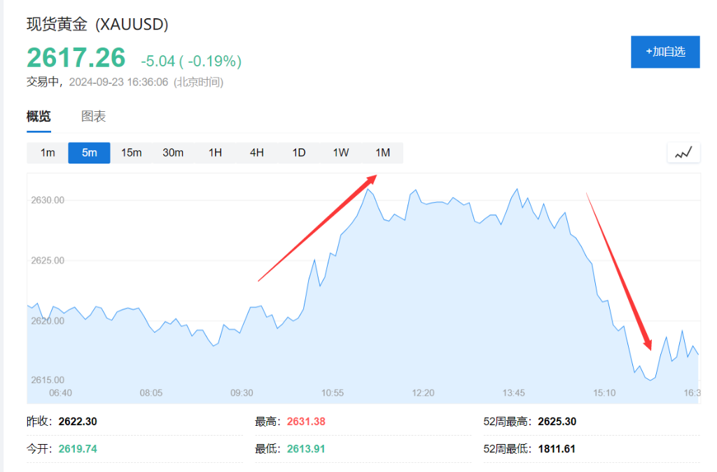 当前,现货黄金已经从日内高点下跌约13美元,暂时报告为2617.26美元/盎司。
