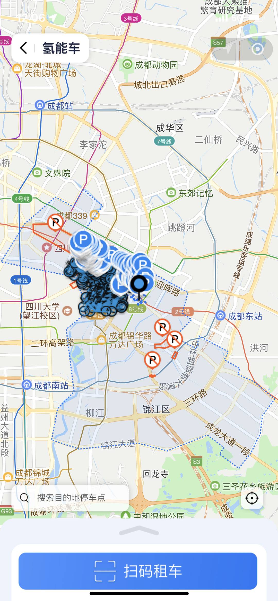当天上午,据网友反映,记者走访了锦江区仙桥北路、武成街等街道,都在街上找到了“氢马”。这辆车主要是蓝色的,车身上印着氢能自行车等字样。通过扫描车上的二维码,进入小程序后,显示该车的运营范围涵盖市中心至三环外的部分区域。
