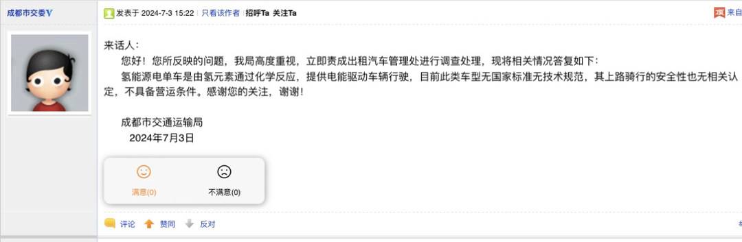 关于“氢马儿”在成都投放,封面新闻进行了一系列报道。此前,成都市交通局在网上回复称,“氢马儿”的安全性没有相关认定,没有运营条件。
