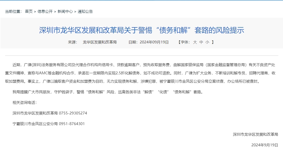 近日,深圳市龙华区发改局通报了《关于警惕“债务和解”套路的风险提示》,提醒广律(深圳)法律服务有限公司(以下简称“广律深圳公司”)及代理合作机构提前向信用卡、逾期贷款客户收取服务费,承诺在一定期限内实现2.5折化解债务,实际上是为了骗取客户资金和加盟费。宁夏银川市金凤区公安局因涉嫌犯罪被立案调查。