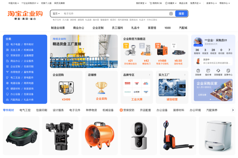 “淘宝企业购”围绕中小微企业的典型采购场景和需求,汇集了淘宝上优质的工业品、商业农业、企业服务、汽配服务、3C数码、家装家居、大小家电等行业类目,精选超百万商家,商品规模覆盖达11亿。同时,面对企业采购群体的体验需求,“淘宝企业购”也针对对公支付、一键开票、采购清单、榜单导购等功能链路进行升级上线,更好满足企业采购需求,提高整体采购效率。