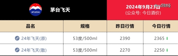 9月23日,2024年飞天茅台原箱报2365元/瓶,较上日价跌了25元;2024年飞天茅台散瓶报2250元/瓶,较上一日再跌20元。
