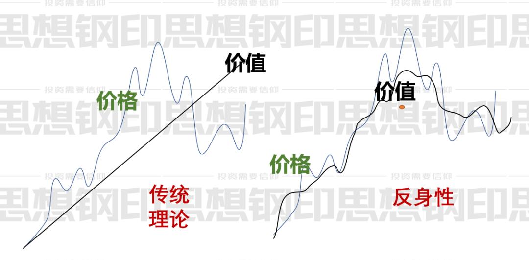 反身理论极大地挑战了“价格围绕价值波动”的说法,因为价格是反身的,所以价值和价格不是逻辑关系,也不是“价格围绕价值波动”,而无角度的“双螺旋结构”,价格与价值相互因果,相互围绕,相互作用。