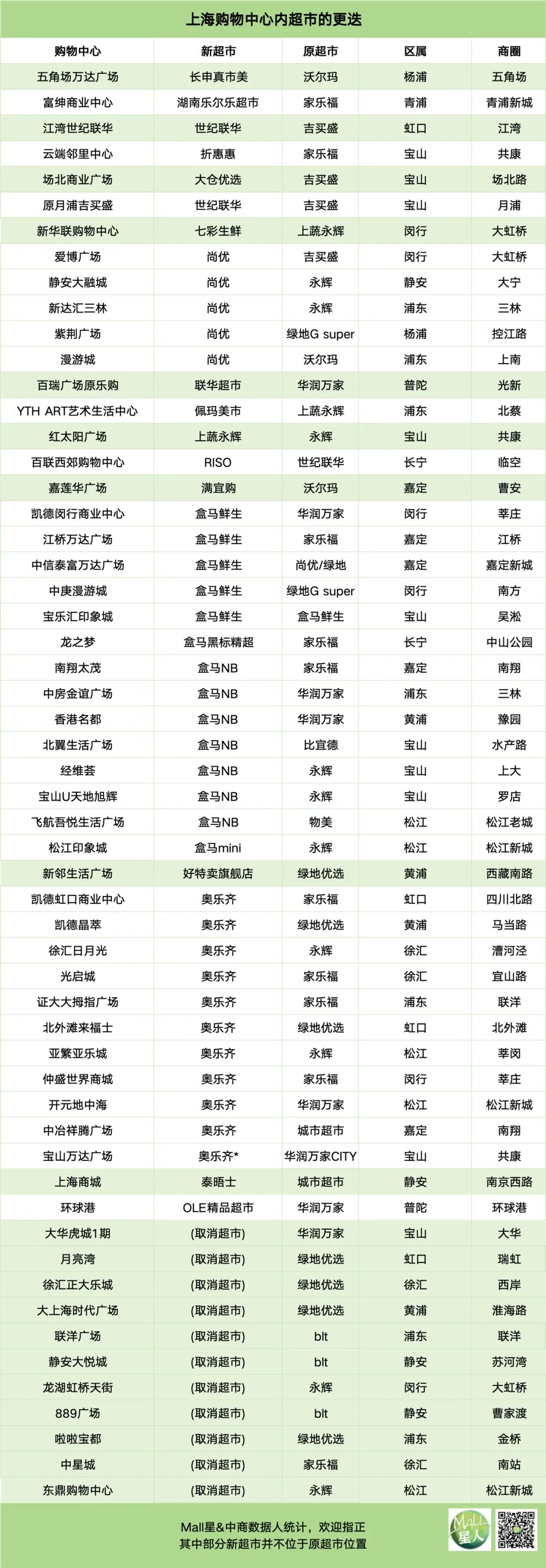 受电子商务和消费降级环境的影响,上海购物中心的超市格局正在发生变化:一方面,大卖场正在倒退。今年上海购物中心的家乐福、华润万家、永辉、卜峰莲花几乎都看不到了,只有阿里系的大润发依然坚挺(欧尚也是高鑫集团,上海有27家大润发。只有即将更新城市的闵行置业广场店自然在20年租约期满后关闭)和百联旗下的世纪联华(百联中环广场旗舰店在月底升级更新,并正在接管江湾、彭浦、月浦等多家与公司相同的大店)。;精品超市方面,城市超市,blt、Gsuper优选绿地、eat!等待40多家商店同样全线退出上海。等待40多家商店同样全线退出上海。