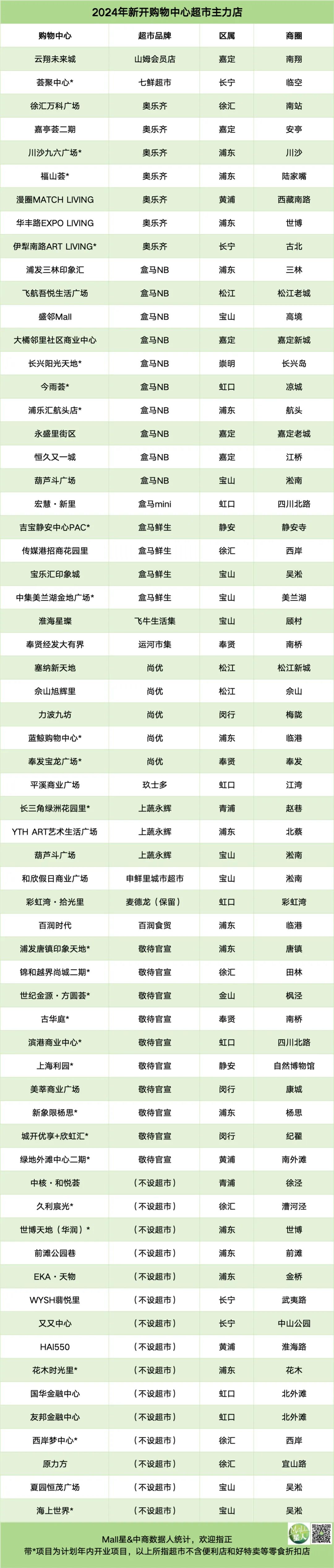 但是盒马(盒马NB最多,其次是盒马鲜生,盒马mini)是2024新开/待开购物中心37家超市的主力店。、奥乐齐的门店数量明显多于其他超市,分别是15家和7家,成为超市拓展的主力军(救星)。其他还包括5家尚优、3家永辉上菜、山姆会员店、七鲜超市、飞牛生活集、运河市场、九士多、申鲜里城市超市等。