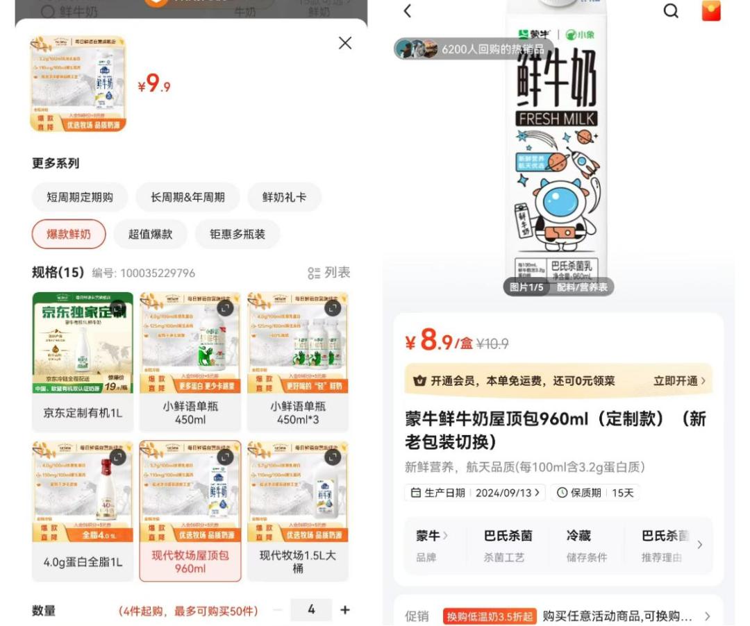 以美团旗下的小象超市为例:在JD.COM超市,蒙牛960ml鲜奶价格为9.9元/盒,要求4件起购。光明新鲜牧场950ml鲜奶价格为9.9元/盒,而同规格的蒙牛鲜奶价格仅为小象超市8.9元/盒,光明鲜奶价格为8.99元/盒,对起购数量没有要求。