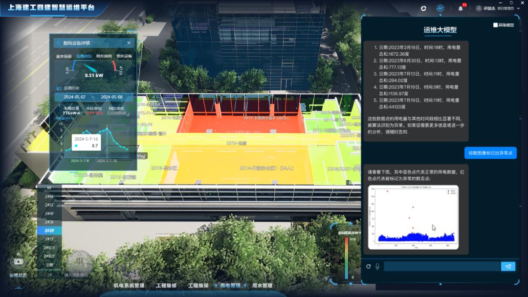 上海建工四建集团推出的一个典型的成功案例,是上海建工四建集团推出的第一个结合大模型和数字孪生建筑智能运维系统。该系统显著提高了客户体验、数据处理和实时响应能力,通过去键平台操作、全流程自动化和定制大模型助手三大创新功能。在提高故障排除效率和客户满意度的同时,系统可以将常规运维需求的响应时间缩短到1秒以内,节约能耗和运维成本。