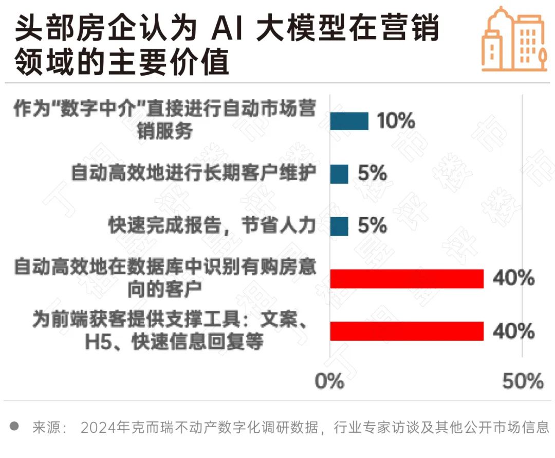 另外,40%的头部房企认为,AI大模型在营销领域的核心价值体现在对潜在客户的高效识别上。AI技术通过对大量数据的智能分析,可以快速选择有购买意向的潜在用户,大大提高了营销精度和转化率。同时,AI模型还具有快速生成文案、H5页面和客户反馈内容的能力,进一步加快了销售流程的响应速度,改善了整体的销售体验,为营销团队提供了有效的支持。