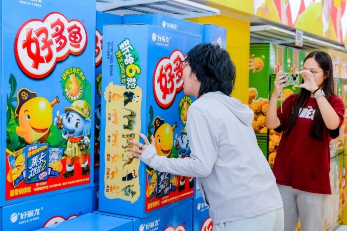 在产品层面,零食忙于与上游品牌厂商合作,不断创新和探索。除了增加基于国家高认知度的单品外,还升级了包装的可玩性和社交性,推出了盐津店“红砖”沙琪玛、辣盒辣条等。此外,商店还建造了巨大的小吃墙和其他具有打卡属性的美丽陈设设备。消费者在这些特色产品和商店设计之前停下来拍照,边买边逛。