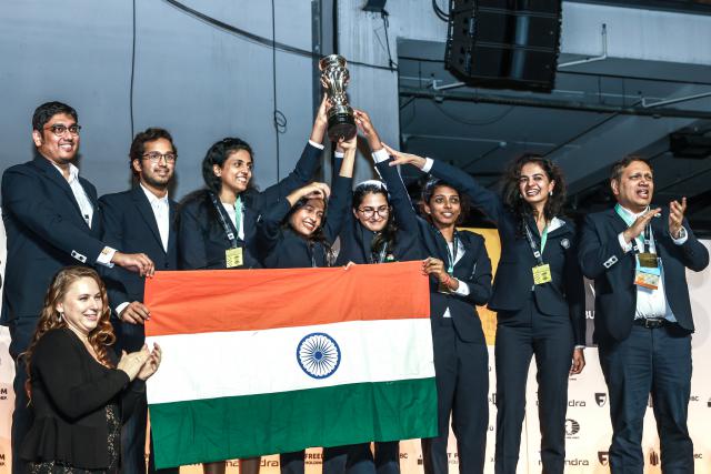 第一次在匈牙利布达佩斯举行 45 今年的国际象棋奥运会团体赛经历了 11 轮角逐,在 9 月 23 日本正式结束,印度男女双方都获得了冠军奖杯,印度还获得了代表一个国家和地区国象整体水平的加普林达什维利杯。和 2018 年第 42 和中国队一样,印度队这次将同时拿到三个奖杯。