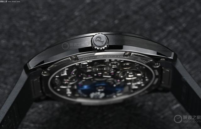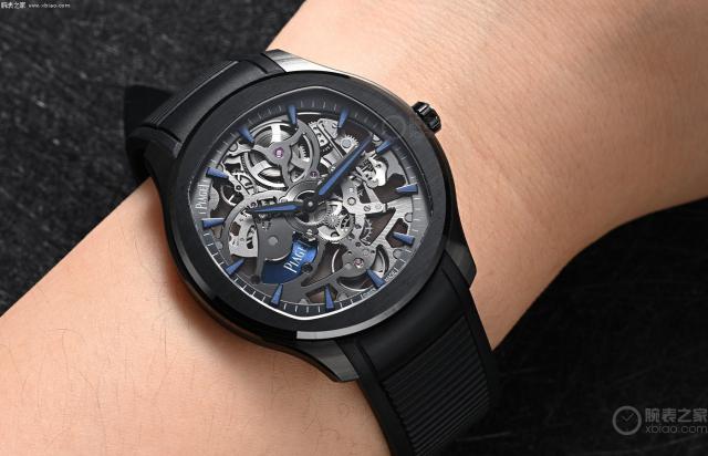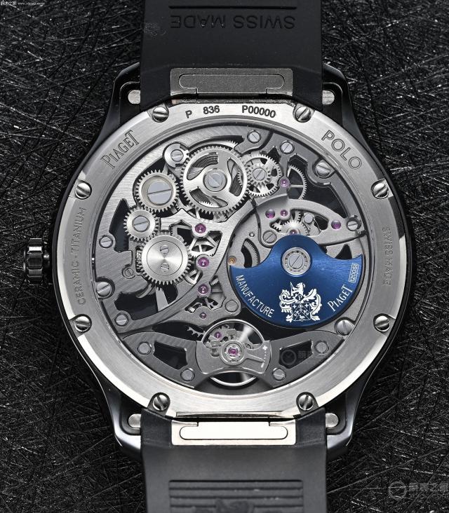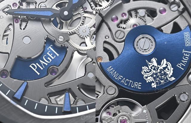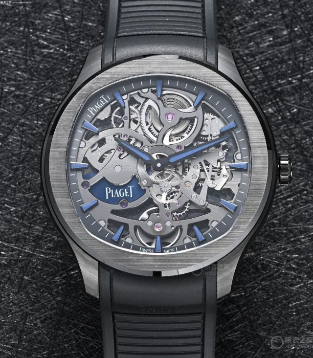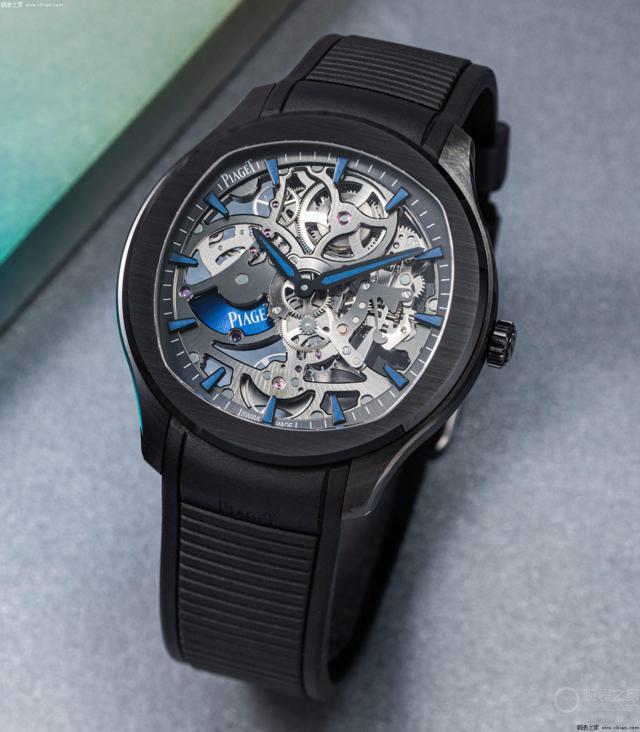 新款伯爵 Polo 镂空瓷器模型,镂空机芯镀灰(钢壳有蓝色模型)。镂空机芯中的“蓝珍珠陀”非常显眼(动力) 44 小时)。手表的指针和时标也是蓝色的,与珍珠相呼应。新瓷壳的另一个细节是,蓝色珍珠上的PIAGET英语已经发出了夜光,可以从手表的正面看到。