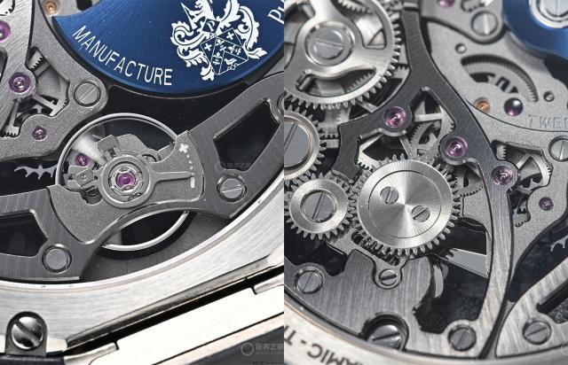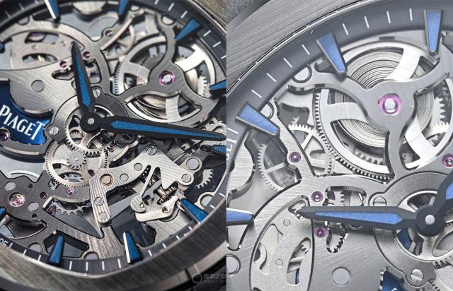 现在有很多现代镂空风格的名表,但是不像其他名表品牌,伯爵对镂空细节的处理更多。除现代镂空一贯的喷砂、拉丝装饰外,伯爵不仅对镂空夹板进行倒角和抛光,而且对大齿轮进行倒角和抛光。露出的螺丝头和沉孔,也有倒角抛光。在其他现代镂空风格的名表中,这些细节的装饰是非常罕见的。在市场上量产的名表中,伯爵镂空表的打磨装饰水平是顶级的。