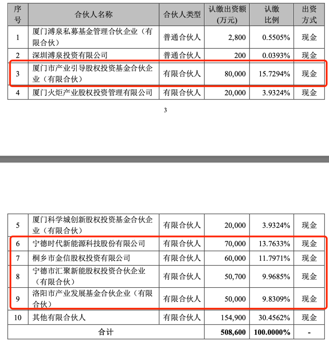 此外,厦门市产业引导股权投资基金合伙企业(有限合伙)出资8亿元,认缴比例为15.7294%;桐乡金鑫股权投资有限公司出资6亿元,认购比例为11.7971%;宁德市聚集新能股权投资合伙企业 (有限合伙)、洛阳市产业发展基金合伙企业(有限合伙)各自出资5.07亿元、5亿元,9.9685%的认缴比例是、9.8309%。