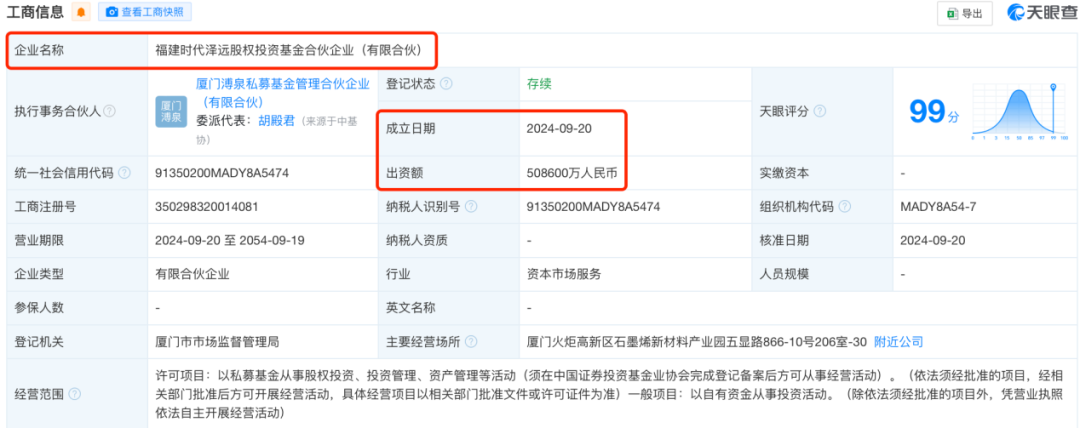 根据天空调查信息,时代泽远基金于今年9月20日成立。股权基金由厦门溥泉私募股权基金管理合伙企业(有限合伙企业)(以下简称厦门溥泉)担任执行合伙人,总投资50.86亿元;主要业务范围是从事股权投资、资本管理、资产管理等活动的私募股权基金,允许以自有资金从事投资活动。